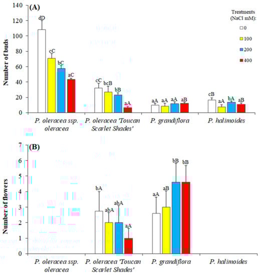 The influence of applied salt stress on the reproductive development of the four studied Portulaca genotypes. (A) Number of flower bud occurrence and (B) number of flowers. Different lowercase letters within each genotype indicate significant differences among the treatments and different capital letters indicate significant differences among the genotypes undergoing the same treatment according to Tukey’s HSD test (P ˂ 0.05).