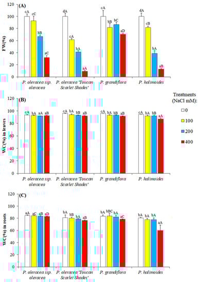 Upon completion of the applied salt treatments, plants were harvested and roots and shoots were weighted. A fraction of material was used for water content determination. Fresh weight in all studied taxa was dramatically reduced under the applied stress conditions (Figure 3A), displaying a reduction of almost 90% under 400 mM NaCl, compared to their respective controls for both P. oleracea “Toucan Scarlet Shades” and P. halimoides. On the other hand, fresh weight was reduced by almost 30% for P. oleracea L. subsp. oleracea under similar conditions, while P. grandiflora had the best resistance as it maintained 70% of its control FW when exposed to the highest stress treatment applied.
