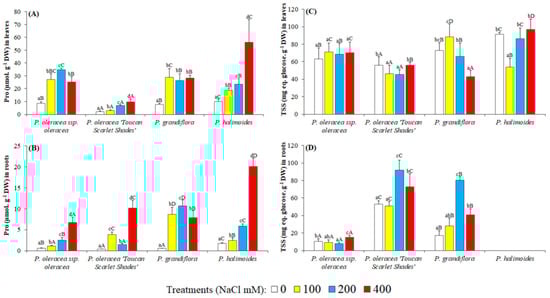 Osmolytes quantified in the four Portulaca genotypes subjected to salt stress treatments. Proline (Pro) and total soluble sugars (TSS) accumulation in the leaves (A,C, respectively) and roots (B,D, respectively). The values shown are means ± SE (n = 5). Different lowercase letters above the bars indicate significant differences between the control plants, and different capital letters indicate significant differences between different genotypes.