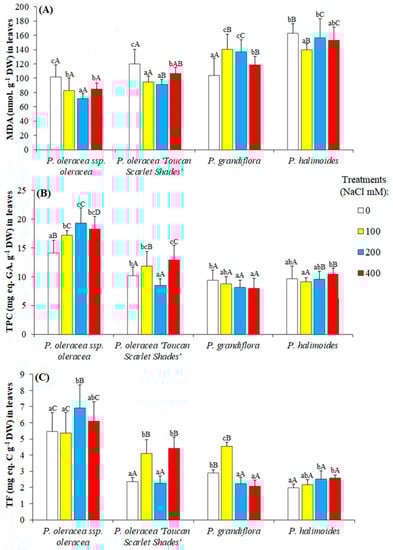 The pattern of variation of total flavonoid content in response to increasing salt concentrations was very similar to that of TPC (Figure 5B,C). Among the untreated control plants, it was observed that flavonoid content varied, with the highest content in P. oleracea L. subsp. oleracea (5.45 C. g−1 DW), while the lowest was in P. halimoides L. (1.97 C. g−1 DW). Under applied salt stress, TPC and TF levels fluctuated in the leaves of all four studied genotypes, showing no strong correlation with the increasing concentrations of applied NaCl, except for P. oleracea L. subsp. oleracea, though P. oleracea “Toucan Scarlet Shades” reported a significant increment in its accumulated TPC and TF when 400 mM NaCl was applied (in comparison to its controls).