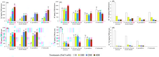 Salinity induced the accumulation of Na+ and Cl− in high amounts in roots and leaves of the four genotypes in response to salt stress acting as Na+ and Cl− includers. Sodium levels in NaCl-treated plants of all genotypes showed an applied-salt-concentration-dependent increase (Figure 6A,B). It increased up to 4.5 mmol g−1 DW in the leaves of 400 mM NaCl stressed plants of P. oleracea L. subsp. oleracea and P. halimoides, while P. oleracea “Toucan Scarlet Shades” and P. grandiflora reported merely half those levels under similar conditions (Figure 6A). Control contents of sodium in the leaves of studied plants were similar in all four genotypes, and the increase was comparable when 100 and 200 mM NaCl were applied. Interestingly however, was the trend in chloride ions accumulation in the leaves, which were expected to mimic that of sodium. P. grandiflora reported chloride levels 4 folds lower than that of P. oleracea L. subsp. oleracea and nearly 2.5 times that of P. halimoides and P. oleracea “Toucan Scarlet Shades” (Table 2). Chloride accumulation in the leaves seemed to reach a plateau after 100 mM NaCl in P. grandiflora and 200 mM in P. halimoides. As for potassium in the leaves (Figure 6C), all studied genotypes reported an increment under 400 mM NaCl, except for P. halimoides which showed a 30% decrement. When correlating the aforementioned data through K+/Na+ ratios, P. oleracea L. subsp. oleracea had the biggest decrease though it had the highest ratio in non-stressed conditions (Figure 6E). Moreover, P. oleracea “Toucan Scarlet Shades” and P. grandiflora had the smallest decrease in this ratio, with the latter retaining the smallest K+/Na+ ratio in control conditions.