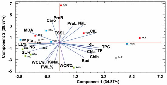 Principal component analysis based on the morphological and biochemical traits measured in plants from control (green), 100 (grey), 200 (blue) and 400 mM (red) NaCl treatments of Portulaca oleracea susbp. oleracea (OLE), P. oleracea cultivar “Toucan Scarlet Shades” (TOU), P. grandiflora (GRA) and P. halimoides (HAL). Abbreviations of the analyzed parameters: SL%, stem length percentage (control being 100%); NS, number of stems; LL%, leaf length percentage (control being 100%); flower bud, number of flower buds; Flo, number of flowers; FWL%, fresh weight percentage of leaves (control being 100%); WCL%, water content percentage in leaves; WCR%, water content percentage in roots; ProL, proline in leaves; ProR, proline in roots; TSS, total soluble sugars in leaves; MDA, malonaldehyde; TPC, total phenolic compounds; TF, total flavonoids; CL, chloride in leaves; NaL, sodium in leaves; KL, potassium in leaves; K/NaL, potassium over sodium ratio in leaves.