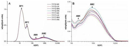 - Yang, X.Y.; Bi, J.G.; Gilbert, R.G.; Li, G.H.; Liu, Z.H.; Wang, S.H.; Ding, Y.F. Amylopectin chain length distribution in grains of japonica rice as affected by nitrogen fertilizer and genotype. J. Cereal Sci. 2016, 71, 230–238. [Google Scholar] [CrossRef]