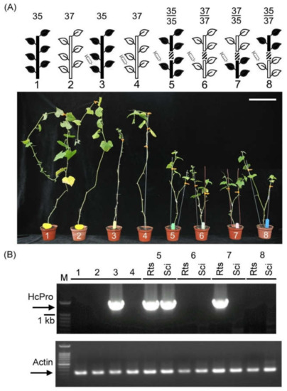 Second, RNA silencing is another well-documented resistance mechanism in plant hosts against virus infection. It is well known that RNA silencing is a fast and efficient method of anti-viral resistance, including the suppression of virus replication and short- and long-distance movement. Several grafting studies have shown that RNA silencing signals could be transmitted and provide antiviral resistance from rootstock to scion in transgenic or nontransgenic plants [22,23,24]. This study also employed grafting experiments to test whether any resistant signal derived from L37 rootstock could transmit successfully and provide resistance in the L35 scion against PRSV-HA. In (Figure 1 no. 8), no symptoms or virus RNA was detected in the L35 scion and rootstock when PRSV-HA was inoculated in the L37 rootstock. This result indicated that the PRSV-HA virus was suppressed in L37 rootstock. Furthermore, when the L35 scion was grafted onto the L37 rootstock, PRSV-HA was pre-inoculated on the L37 rootstock one to three times, and the L35 scion was also inoculated at the last inoculation, no symptoms occurred in L35 scion (Figure 2). These results indicated that there must be resistance signals in L37 that could be transmitted and provide resistance to the L35 scion, even after it was inoculated with PRSV-HA (Figure 2B no. 7–9). These results indicate that RNA silencing might also play an important role in L37 resistance against PRSV-HA, similar to the previous grafting studies mentioned above.