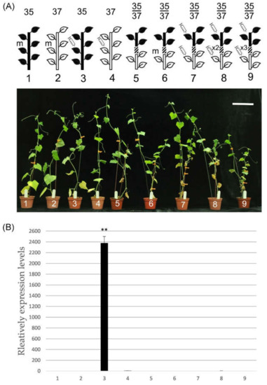 PRSV induced systemic resistance in L37 rootstock. (A) Schematic and grafted plants after PRSV-HA inoculation. Nos. 1 and 2 are L35 and L37 nongrafted plants inoculated with the mock control. Nos. 3 and 4 are L35 and L37 nongrafted plants inoculated with PRSV-HA. Nos. 5–9 are L35 scions grafted onto L37 rootstocks. No. 5 is a grafted plant with a noninoculated control, and No. 6 is a grafted plant inoculated with a mock control. No. 7–9 are L35 scions grafted onto L37 rootstock and then inoculated into L37 rootstock one to three times by PRSV, and the L35 scions were inoculated the same time as the last L37 rootstock inoculation. Schematic drawing and symbols are as in Figure 1. ×2 and ×3 indicate PRSV-HA inoculated in the L37 rootstock twice and three times at two-day intervals, respectively. The white bar indicates 30 cm. (B) qRT-PCR analysis of PRSV-HA HCPro RNA accumulation in the scion L35 systemic leaves. Total RNA was extracted from the systemic leaves of four-week-old nongrafted or grafted C. metuliferus plants 7 dpi. Relative amount of HCPro RNA was normalized to Actin mRNA. Values represent the fold change, relative to the negative control, as means ± standard deviation from three biologically independent experiments. Asterisks indicate statistically significant difference (** p < 0.01 by Student’s t-test).