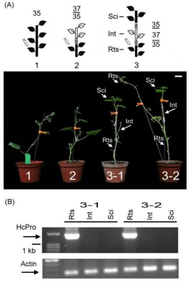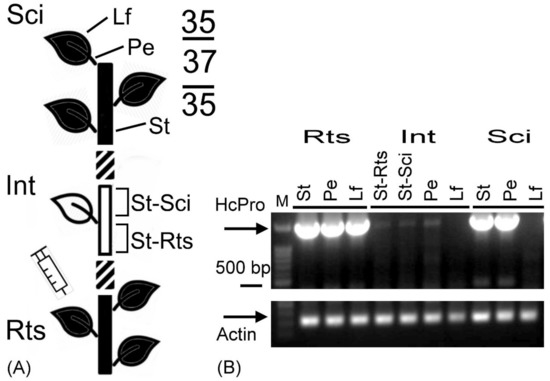 Furthermore, the PRSV-HA HCPro RNA in the stem, petiole, and leaf tissues of the plants in the double sandwich grafting was surveyed. The results showed that HCPro RNA was detected in the leaf, petiole, and stem tissues of the pre-inoculated L35 rootstock as expected (St, Pe, Lf of Rts in Figure 4B). HCPro RNA was also detected in the stem and petiole of the L35 scion (St, Pe of Sci in Figure 4B), and very trace amounts of virus were detected in the L37 intermediate (St-Rts, St-Sci, and Pe of Int in Figure 4B). The results clearly indicated that L37 did not restrict the systemic movement of PRSV-HA in the vascular tissues, which could also arrive at the stem and petiole of the L35 scion. Most importantly, PRSV-HA was not detected in the leaf tissues of the L37 intermediates and L35 scions (Lf of Int and Sci in Figure 4B) and consequently indicated that the systemic resistance signal derived from the leaf of the L37 intermediate could be transmitted to the leaf of the L35 scion in which PRSV-HA was silenced, and no symptoms were observed.