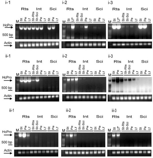 Three PRSV RNA accumulation patterns were revealed in the double sandwich grafting plants. The intermediate (Int) L37 and scion (Sci) L35 were grafted onto pre-inoculated L35 rootstock (Rts) in turn. Each plant part was subdivided into leaf (Lf), petiole (Pe), and stem (St) tissues. Analysis of PRSV HCPro RNA accumulation in double sandwich grafting plants revealed three patterns in which three plants are shown (-1, -2, -3): (i) PRSV accumulated in the L35 rootstock and in petiole and stem tissues of intermediate L37 and scion L35. (ii) PRSV accumulated in the pre-inoculated L35 rootstock and in the petiole and stem tissues of the intermediate L37. In the ii-3 grafting plants, trace amounts of the virus were detected in the leaves of the L37 intermediate. The gel image was strengthened by inverting it. (iii) PRSV accumulated only in the pre-inoculated L35 rootstocks, and no virus was detected in the intermediate L37 and scion L35. Each gel photo represents a different biological replicate. Lf* indicates severe malformation of the leaf and petiole were combined into one sample. Actin indicates the internal control; M indicates the molecular marker.