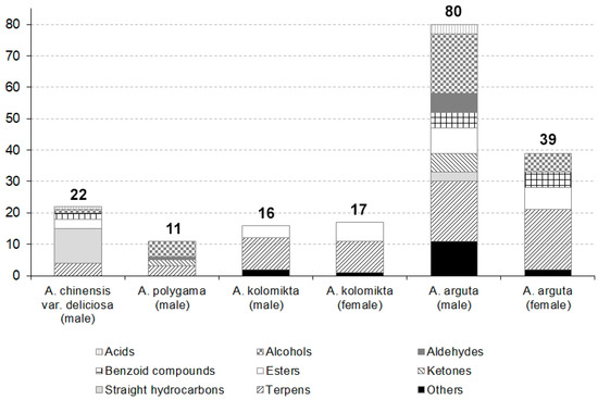 Differences in number and composition of volatile compounds in particular actinidia species.