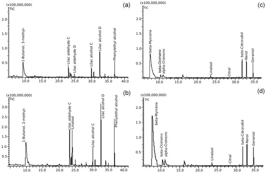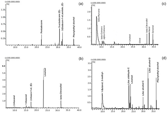 Sample chromatograms with main volatile compounds in flowers of female and male Actinidia arguta (a,b) and Actinidia kolomikta (c,d) genotypes: (a) “Ananasnaya”, (b) “Nostino”, (c) female, (d) male.