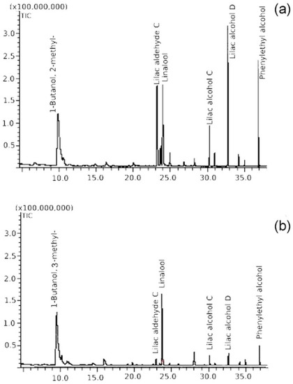 Sample chromatograms with main volatile compounds in flowers of two different male Actinidia arguta genotypes (a) “Nostino” (b) “Haya Kume”.