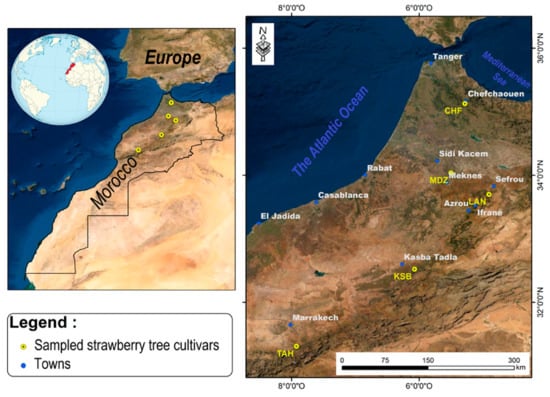 Five genotypes of the strawberry tree (Arbutus unedo L.) were collected between October and November 2019 named (Chefchaouen (CHF), Moulay Driss Zerhoun (MDZ), Laanoucer (LAN), El Ksiba (KSB), and Thnaout (TAH)), where they grew spontaneously (Table 1; Figure 1). Morphological key characters of both tree and its flowers and leaves were used for in-situ trees selection (International Plant Genetic Resources Institutes (IPGRI)) and CIHEAM) []. This selection was also performed through a survey with a local population, since surveyed geographical sites represent an endemic area for species growth in Morocco. Each area hosts typical, spontaneously growing strawberry tree clones.