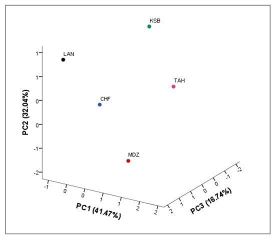 A three-dimensional (3D) scatter plot was prepared according to the first three principal components: PC1, PC2, and PC3, (respectively 41.47, 32.04, and 16.74% of total variance), that discriminate between the genotypes according to their physicochemical and biochemical characteristics (Figure 3). Starting from negative to positive values of PC1, the distribution of genotypes indicated an increased in the moisture content, total soluble solids, and the most of phenolic compounds. Whereas, starting from negative to positive values of PC2, total phenols, total flavonoids, and total anthocyanins decreased in their values. However, starting from negative to positive values of PC3, the distribution of genotypes indicated an increase in the pH, titratable acidity, and antioxidant activity (DPPH, ABTS, and β-carotene). Cultivar distribution showed a very distinctive profile of each sampled cultivar, since each one formed a single sub-cluster. This indicates a potential phenotypic divergence within the species, which deserves to be further explored in the agroecosystems prospected, in order to build a collection to preserve these resources vital to the advancement of the local agricultural and livelihood. Overall, our results are in agreement with several studies [,]. These studies indicated that high diversity in biochemical traits could be used as an efficient marker system to discriminate between strawberry tree genotypes.