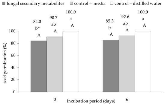 Overall, culture filtrates from E. nigrum strains significantly limited the percentage of the germinated garden cress seeds, when compared to the control group with sterile distilled water after 3 days (p fungal secondary metabolites, control with distilled water = 0.000241) and 6 days (p fungal secondary metabolites, control with distilled water = 0.000895) of incubation. In the culture filtrates, the amount of seeds germinated after 3 days of incubation was lower by 16% and by 14.7% after 6 days, compared to the control group with sterile distilled water, which did not show limited seed germination after both incubation times. Similarly, statistically significant dependence was not observed in the case of fungal culture filtrates and the control group with the medium. This insignificant difference between the two variants of the experiment was 6.7% and 7.3% of germinated seeds, respectively after 3 and 6 days of incubation. It should also be noted that the differences between incubation periods were not statistically different for all of the experimental variants (Figure 1).