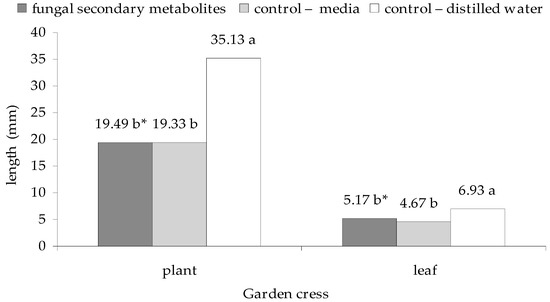 On the other hand, significant differences were recorded in the case of the growth rate of this plant. The weakest effects on the growth of seedlings and top leaves were exhibited by distilled water (the control group), and the impact of a control group with media, as well as the filtrates from E. nigrum strains were at the similar level (p weather, fungal secondary metabolites = 0.006424 for seedlings, and p weather, fungal secondary metabolites = 0.004022 for leaves). In summary, the growth of the cress seedlings (plants and leaves) did not differ with statistical significance when the fungal filtrates or the medium were applied, but both these variants of the experiment differed significantly from the control group with water. The plant growth was, in that case, more than 44% higher, compared to the other two experimental variants, and the length of the leaves was longer by 25.4%, compared to fungal filtrates and by 32.6%, compared to the control groups with medium—Figure 4.
