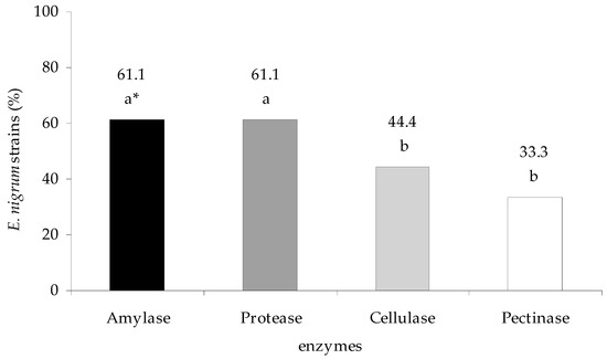 The percentage of E. nigrum strains among the 18 tested synthesizing a given enzyme. Means followed by the same letter (*) are not statistically different at the α ≤ 0.01 level according to the Tukey HSD test.