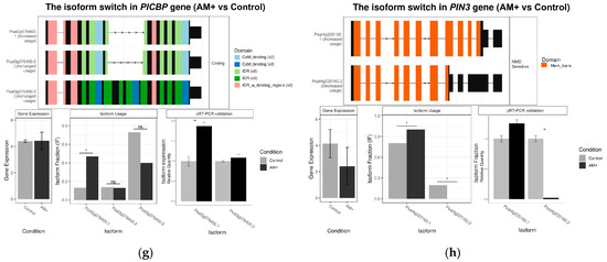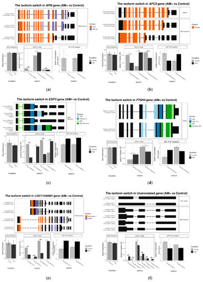 - Vitting-Seerup, K.; Sandelin, A. IsoformSwitchAnalyzeR: Analysis of changes in genome-wide patterns of alternative splicing and its functional consequences. Bioinformatics 2019, 35, 4469–4471. [Google Scholar] [CrossRef]