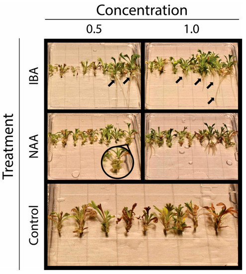 Independent of the reasons for the differences between rooting clusters, the analysis indicated that in all clusters, IBA, particularly at 1 mg/L, was the most effective treatment in promoting adventitious root formation. In the blue cluster, the IBA treatments also had a higher percent of shoots forming roots (87.2%) and a higher number of roots per shoot tip (ca. 3 roots per shoot tip) than any other cluster by treatment combination.