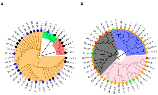 Ridgeline plots comparing callus (a) and root (b) formation in shoot tips of Artemisia tridentata subsp. tridentata. Clusters are identified by different colors (see Figure 2). On the y-axis, G1 or G2 refers to the genotype and the letters and numbers to individual lines.