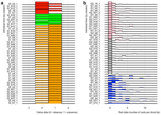 The clustering analysis based on the number of roots per shoot tip (15 shoot tips in total) revealed three rooting clusters (Figure 2; Figure 3): (i) grey cluster (n = 15 with 7 G1 and 8 G2): comprising individual lines exhibiting no to very limited rooting, (ii) pink cluster (n = 17 with 9 G1 and 8 G2): comprising individual lines exhibiting limited rooting and (iii) blue cluster (n = 13 with 7 G1 and 6 G2): comprising individual lines showing high rooting capacities independent of treatment. As expected, the two top individual lines identified by the Wilcoxon test are in the blue rooting cluster (Figure 3). We also analyzed whether the clusters identified based on callus data matched those found for roots. In general, this comparison shows a lack of matching between the callus and root clusters (Figure 2). However, one trend in Figure 2 is that most blue cluster individual lines are within the callus orange cluster, which had the highest callus development frequency (Figure 2 and Figure 3).
