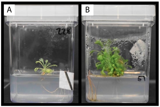 Visual comparison of plantlet heights after 5 weeks of culture. (A) Plantlet grown from the shoot tip of G1_b20_1 individual belonging to the pink rooting cluster (see Figure 2). (B) Plantlet grown from the shoot tip of G2_b27_1 individual belonging to the blue rooting cluster (Figure 2). Note: leaf shape differs from that of adult individuals due to the in vitro growing environment and heterophylly between juvenile and adult development phases.