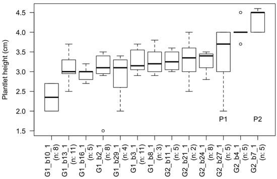 Boxplot showing plantlets heights after five weeks of culture for individuals belonging to the blue rooting cluster of Artemisia tridentata subsp. tridentata. The n indicates the number of plantlets cultured for each individual. The “P” indicates the top performers as identified by the statistical analyses.