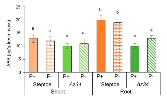 - Trull, M.C.; Guiltinan, M.J.; Lynch, J.P.; Deikman, J. The responses of wild-type and ABA mutant Arabidopsis thaliana plants to phosphorus starvation. Plant Cell Environ. 1997, 20, 85–92. [Google Scholar] [CrossRef]
