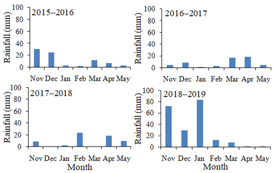 Annual rainfall in the study area typically occurs mainly in November and extends through May (Figure 1). The extent of rainfall differed between the four growing seasons of the present study. Total rainfall was 82.1 mm in the 2015–2016 season, 56.9 mm in the 2016–2017 season, 64.3 mm in the 2017–2018 season and 207.3 mm in the 2018–2019 season.