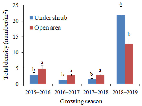 Effects of Haloxylon salicornicum shrubs on the total density of annual plants in four growing seasons. Values are means ± SD. Different letters indicate significant difference at p < 0.05 between under shrub and open area in each growing season.