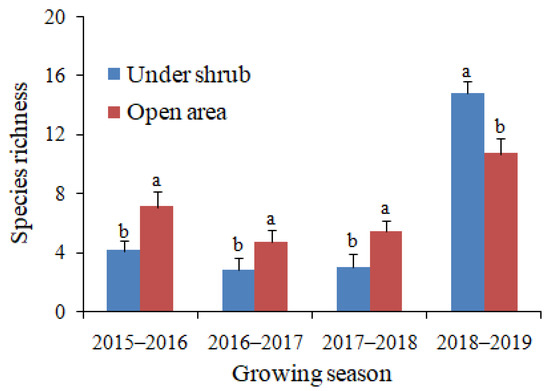 Effects of Haloxylon salicornicum shrubs on the species richness of annual plants in four growing seasons. Values are means ± SD. Different letters indicate significant difference at p < 0.05 between under shrub and open area in each growing season.