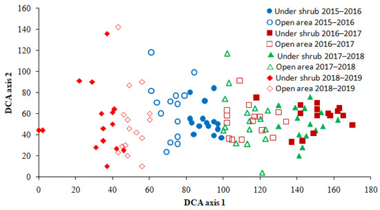 The Detrended Correspondence Analysis (DCA) ordination showed the separation of six groups according to the microhabitat and growing season (Figure 4). These groups were arranged mainly along axis 1 from left to right in the order: under shrub 2018–2019, open area 2018–2019, open area 2015–2016, under shrub 2015–2016, open area 2016–2017 and 2017–2018, and under shrub 2016–2017 and 2017–2018. Observations representing the shrub microhabitat were separated from those of open area. Furthermore, observations made in the same microhabitat in different growing seasons were separated from each other except for the two growing seasons, 2016–2017 and 2017–2018 (Figure 4). The distribution of observations in the ordination plot suggests that the structure of annual plant community is affected by H. salicornicum shrubs, and varied among growing seasons.