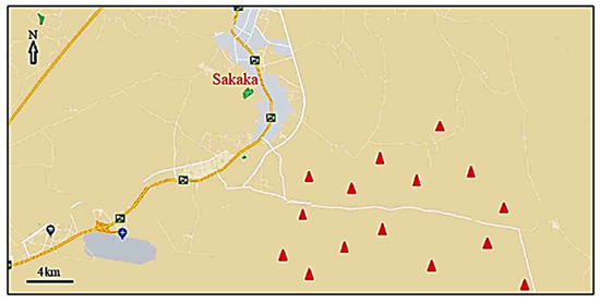 The study region is a sandy desert, representing the northern reaches of the Nafud desert, the second largest (after the Rub Al Khali) sand-dune desert in Saudi Arabia. The study area (Figure 5) is located 10–30 km south east of Sakaka city (29°58′11.06″ N 40°12′23.08″ E) in Al-Jouf Region, northwestern Saudi Arabia. The climate is hyper-arid with 55 mm mean annual rainfall (average from 2000–2010). The amount of yearly rainfall is variable. The rainy period and, accordingly, the growing season, extends mainly from November to May. The region is characterized by hot summers and cool winters. The mean monthly air temperature varied between 9.8 °C occurring in January and 33.8 °C in August. The lowest and highest average monthly relative humidity are 16% in June and 53% in January, respectively (Al-Jouf meteorological station).