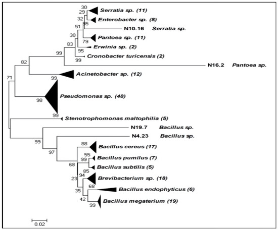 The rationale of plant’s selection capacity has been widely demonstrated, and also the use of the rhizosphere as a source of highly specialized strains [29,30,31], since it is one of the most complex and diverse ecosystems on earth. This suggests a definite role of plant-derived metabolites in the microbiome assemblage in the rhizosphere [32,33]. According to previous results, the common culturable bacterial genera in the rhizosphere of N. glauca includes Bacillus sp., Pseudomonas sp., Enterobacter sp., Acinetobacter sp., Burkholderia sp., Arthrobacter sp., and Paenibacillus sp. [21].