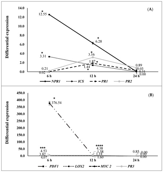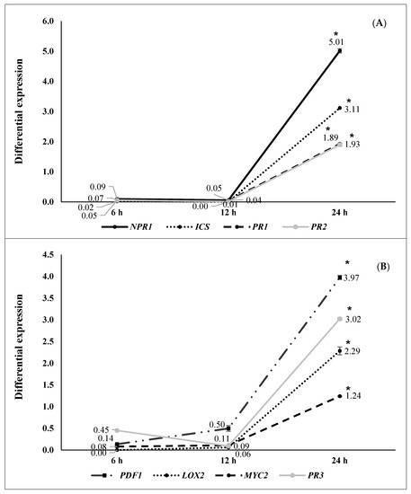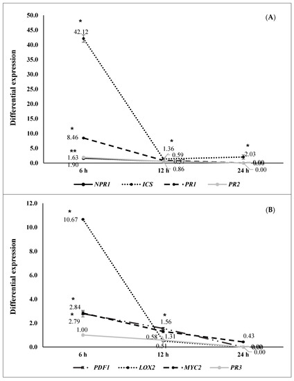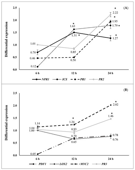 Differential gene expression (seedlings inoculated with N 21.24 (Pseudomonas fluorescens) vs negative control) at 6 (n = 16), 12 (n = 16) and 24 (n = 16) hapc; (A) NPR1, ICS, PR1, and PR2 genes (as SA signaling pathway markers) and (B) PDF1, LOX2, MYC2, and PR3 (as JA/ET signaling pathway markers). Asterisks represent statistically significant differences (p < 0.05) with respect to negative control (differential expression of 1).