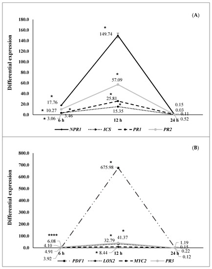 Differential gene expression (seedlings inoculated with N 5.12 (Pseudomonas putida) vs negative control) at 6 (n = 16), 12 (n = 16) and 24 (n = 16) hapc; (A) NPR1, ICS, PR1, and PR2 genes (as SA signaling pathway markers) and (B) PDF1, LOX2, MYC2, and PR3 (as JA/ET signaling pathway markers). Asterisks represent statistically significant differences (p < 0.05) with respect to negative control (differential expression of 1).