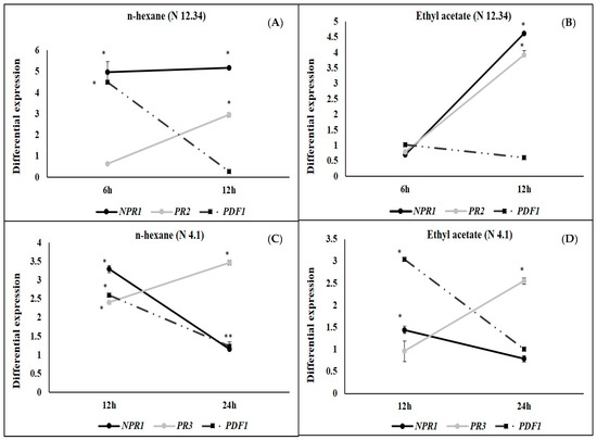 Differential gene expression in plants under the following treatments: (A) N 12.34 elicitors from the n-hexane fraction; (B) N 12.34 elicitors from the ethyl-acetate fraction; (C) N 4.1 elicitors from the n-hexane fraction; and (D) N 4.1 elicitors from the ethyl-acetate fraction vs negative control, at 6 (n = 16) and 12 (n = 16) hapc in N 12.34 (A,B), and at 12 (n = 16) and 24 (n = 16) hapc in N 4.1 (C,D). NPR1 and PR2 genes as markers of the SA signaling pathway and PDF1 as marker of the JA/ET signaling pathway in N 12.34; NPR1 as marker of the SA signaling pathway, and PDF1 and PR3 as markers of the JA/ET signaling pathway in N 4.1. Asterisks represent statistically significant differences (p < 0.05) within each sampling time. Genes and sampling times were chosen based on results obtained by bacterial strains (Figure 4 and Figure 6).