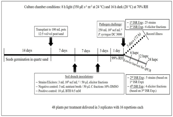 A. thaliana wild type Columbia ecotype 0 seeds (provided by the Nottingham Arabidopsis Stock Centre (NASC)) were germinated in quartz sand and two-week-old seedlings were then individually transplanted to 100 mL pots filled with 12:5 (v/v) peat/sand mixture (60 g/pot). Forty-eight plants per treatment (strains and controls) were used; plants were arranged in three replicates, with sixteen repetitions each. Plants were watered with 5 mL of tap water once a week and with 5 mL of half-strength Hoagland solution per plant once a week. Strains were inoculated twice by soil drench with 3 mL of a suspension of bacterial cells, grown for 24 h in nutrient broth (CONDA) at 28 °C, and adjusted to a density of 108 cfu mL−1, in the first and the second week after transplant. Negative control plants were mock-inoculated by soil drench with 3 mL of sterile nutrient broth and positive control plants were inoculated by soil drench with 10 µL of BTH (Benzothiadiazole) 0.5 mM [28]. Four days after the second bacterial inoculation, plants were pathogen challenged with P. syringae DC3000. One day before pathogen challenge, plants were maintained with 99% relative humidity to ensure stomata opening in order to allow disease progress. P. syringae DC3000 was centrifuged (10 min at 2890× g) and cells were suspended in 10 mM MgSO4 to achieve 108 cfu mL−1. It was inoculated by spraying the total of the plants with 250 mL. Plants were incubated in a culture chamber (Sanyo MLR-350H) with an 8 h light (350 μE s−1 m−2 at 24 °C) and 16 h dark period (20 °C) at 70% relative humidity for 72 h, and disease severity was recorded as the number of leaves with disease symptoms relative to the total number of leaves. Results were relativized using the disease severity of negative control plants as 0% protection. All the ISR experimental design is represented as a timeline in Figure 8.