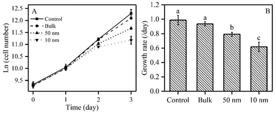 Effects of three sizes of TiO2 particles on the growth of S. obliquus. Panel (A): Growth curves; Panel (B): Growth rate; Different letters on the error bars represent significant (Tukey’s honestly significant difference (HSD), p < 0.05) differences. Values are represented as means ± SD (n = 6).