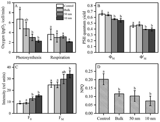 Effects of three sizes of TiO2 on photosynthetic parameters in S. obliquus after 72 h exposure. (A) Oxygen evolution/consumption under growth light and dark conditions, respectively; (B) PSII quantum yield; (C) Maximal and minimal fluorescence yields (FM and F0); and (D) non-photochemical quenching (NPQ). Different letters on the error bars represent significant (Tukey’s HSD, p < 0.05) differences. Values are represented as means ± SD (n = 3).