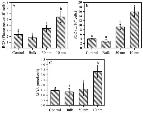 ROS, SOD and MDA contents of S. obliquus under three sizes of TiO2 exposure after 72 h. (A) ROS content; (B) SOD activity; and (C) MDA content. Different letters on the error bars show significant (Tukey’s HSD, p < 0.05) differences. Values are represented as means ± SD (n = 3).