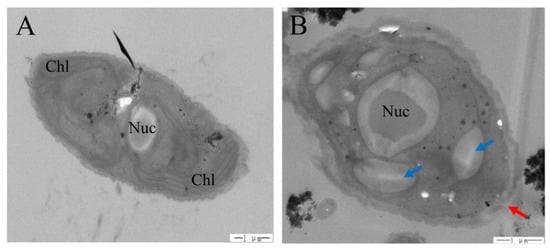 Effects of 10 nm TiO2 on the cell structure of S. obliquus after 72 h exposure. (A) Control, and (B) 10 nm-TiO2. Blue arrow shows a vacuole while red arrow shows cell membrane breaking. Chl: Chloroplast; Nuc: Nucleus.
