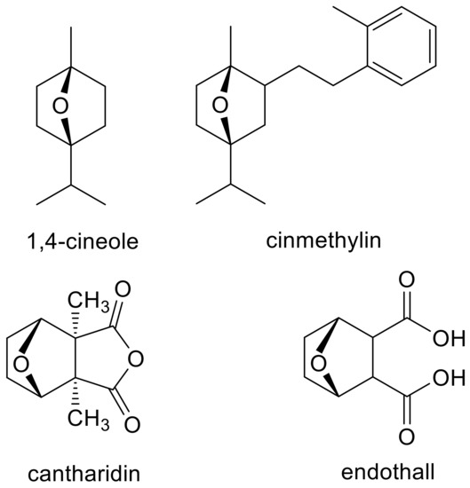 Examples of natural phytotoxins (1,4-cineole and cantharidin) that may have inspired synthetic, commercial herbicides (cinmethylin and endothall).