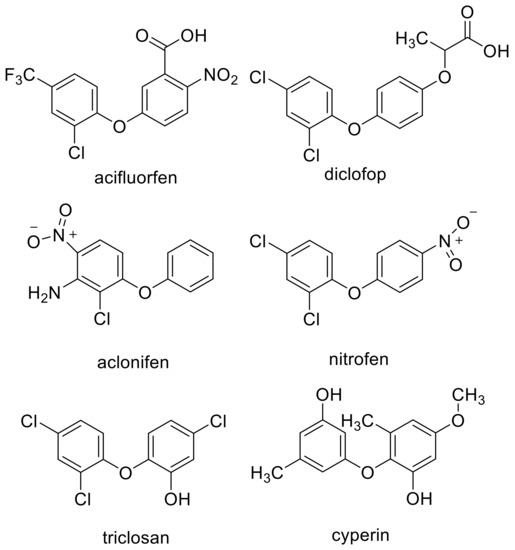Similarities between the molecular structure of a compound with an unknown MOA to that of a compound with a known MOA can provide an obvious clue to the MOA. For example, the MOA of the commercial herbicide endothall (Figure 1) was unknown for many years. However, its structural similarity to the natural compound cantharidin (Figure 1), known to inhibit serine/threonine protein phosphatases, led Bajsa et al. [12] to determine whether this was also the case for endothall. It was, and they also found cantharidin to be a potent phytotoxin by the same mechanism. However, a small change in a chemical structure can cause a change in MOA. For example, there are phytotoxic diphenyl ether compounds with very different MOAs, such as PPO (e.g., acifluorfen) [19], acetyl-CoA carboxylase (ACCase) (e.g., diclofop) [21], solanesyl diphosphate synthase (aclonifen) [22], plastid ATPase (nitrofen) [23], and enoyl reductase (the synthetic compounds triclosan and the fungal phytotoxin cyperin) [24] (Figure 2). All of these are target sites for commercial herbicides except for enoyl reductase. Diphenyl ether compounds have been reported from plants (e.g., [25]), but we are unaware of reports of whether any of them are phytotoxic or not. There may be other target sites for other diphenyl ether compounds that have not been described, and it is highly likely that some diphenyl either compounds have more than one molecular target site as a phytotoxin (see Section 4.7). Diphenyl ethers are perhaps an extreme case, but they are a clear example that structural similarity clues can be misleading, even though they are sometimes helpful.