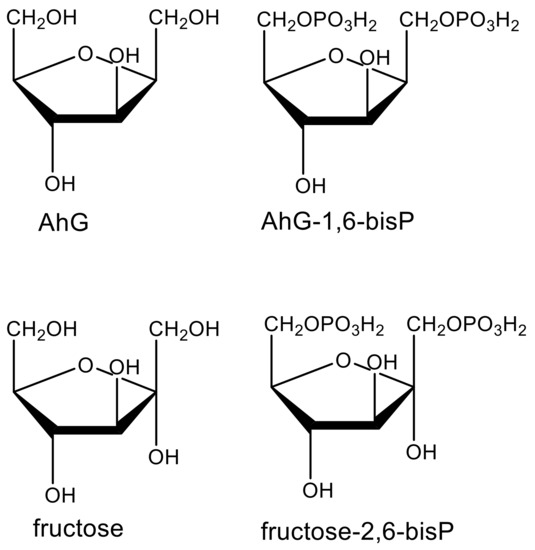 Structures of the fungal phytotoxin 2,5-anhydro-d-glucitol (AhG), fructose, and their phosphorylated forms.