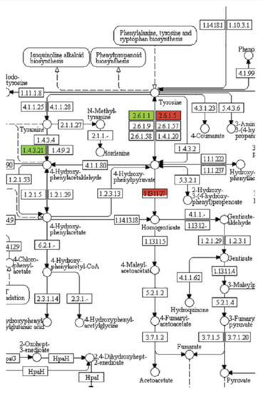 Example of Kyoto Encyclopedia of Genes and Genomes (KEGG) analysis of the effects of t-chalcone on transcription of genes of tyrosine metabolism of Arabidopsis roots 1 h after exposure. The level of color saturation of green and red represents the level of down- and upregulation, respectively. This is a portion of a more detailed figure from [43].