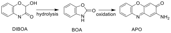 Conversion of the relatively weak and unstable allelochemical (DIBOA) to a strong, more stable phytotoxin (APO) that occurs in soil.
