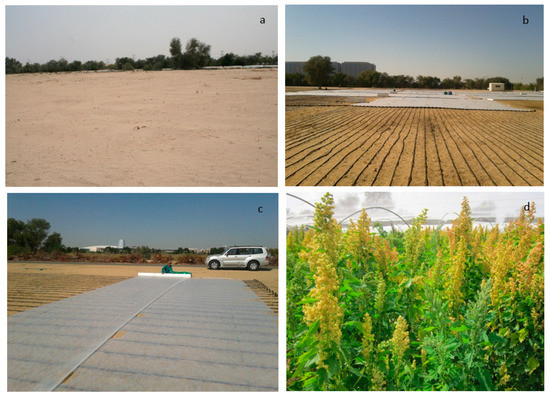 Figure 1. Photos to illustrate the sandy desert marginal soil of ICBA (a); irrigation system installation (b); quinoa seed sowing and covering with acryl sheet to protect from bird attacks (c); quinoa crop at panicle stage (d).