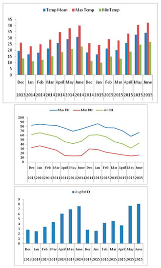 During each growing season, saline water treatments (0, 10 and 20 dS m−1) were established and applied after one month from sowing (to ensure plant establishment) using drip irrigation system. Irrigation was supplied via a drip system (drip laterals of 16 mm in diameter), 0.25 cm emitters and were delivering 4.0 L h−1. The experimental plots were equipped with three irrigation valves from RainBird Company (Azusa, CA, USA). One valve was handling fresh, other saline and third valve (a solenoid valve of 2” size) controlling both saline and fresh water after the main control valve. The 3rd valve was controlling the irrigation water according to the main controller instructions. Saline irrigation water was provided from seedlings (one month old) to the grain filling stage. The climate data in terms of temperature, rainfall, wind speed and humidity was collected from weather station established at the ICBA (Figure 2).