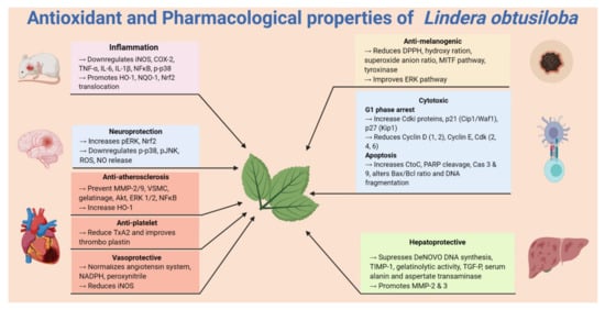 Several other species of the Lindera genus, such as L. reflexa, L. fruiticosa, L. angustifolia, L. oxyphila, and L. umbrellata have been reported to possess antioxidant activity in separate studies [41,42,43,44,45,46]. Hence, this genus represents a natural source of highly active antioxidant compounds that can scavenge free radicals and inhibit lipid peroxidation. Both extracts and bioactive compounds of this genus can modulate several oxidative pathways, including Nrf-2/HO-1, ERK, JNK, mitogen-activated protein kinase (MAPK), and ARE that are involved in oxidative stress-mediated cell death, cell proliferation, inflammation, etc.