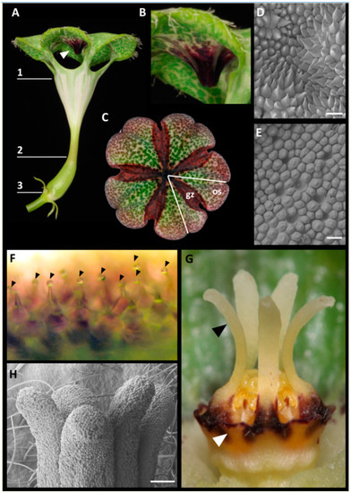 Morphology of Ceropegia sandersonii trap flowers. (A) The parachute-like tubular corolla is formed by fusion of five petals and has three functional parts, i.e., (1) the umbrella-like corolla tip, (2) the funnel-shaped corolla tube, and (3) the inflated base enclosing the synorganized reproductive organs, i.e., gynostegium. The white arrowhead indicates the uvula, a purple protrusion on the underside of the umbrella-like corolla tip; (B) close up of the uvula; (C) umbrella-like corolla tip stained with neutral red. Each of the five corolla lobes (one lobe separated by white lines) comprises osmophoric tissue (os) and gliding zones (gz; stained with neutral red); (D) SEM image of the epidermal surface of the uvula; (E) SEM image of the osmophoric cells on the corolla lobes; (F) LM image of the conical acuminate to caudate epidermis cells of the gliding zones on the corolla lobes with liquid droplets at their tips (magnification: 160×); (G) gynostegium formed by fusion of male and female reproductive organs. It is surrounded by the corona with slender and apically spreading staminal corona lobes (black arrowhead) and interstaminal corona lobes forming nectar cups (white arrowhead); (H) SEM image of the globular epidermis cells of staminal corona lobes of a mature flower. Abbreviations: os—osmophoric zone, gz—gliding zone. Scale bars: 30 µm in (D,E), 200 µm in H. Photographs by AH and David Styles.