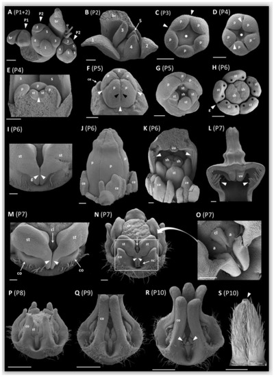 Ten different developmental phases (P) of Ceropegia sandersonii flowers from initiation to synorganization of floral organs. (A) shoot apex with three developing flowers (indicated by arrowheads), one thereof in developmental phase P1, and two in phase P2 with sepals initiating in a sequence from first (1) to last (5); (B) sequentially developing sepals in late phase P2 with numbers 1–5 indicating the sequence of development; (C) bud in P3 (sepals removed) with early congenital fusion (white arrowheads) of petal bases and a slight central depression (filled circle); (D) bud in P4 (sepals removed) with distinct central depression (filled circle); petals show first signs of postgenital fusion at their tips (white arrowheads); (E) cross section of bud in phase P4 revealing stamen initiation; sepals visible in the background; (F) bud in phase P5 with corolla fully enclosing the developing reproductive organs. Petals are congenitally fused at bases (white arrowheads) and entirely postgenitally fused at upper parts with valvate margins (one thereof indicated by black arrowheads). Colleters begin to develop; (G) bud in P5 with two petals removed revealing the early stamens and the developing halves of the style-head in the center; (H) top view of developing gynostegium in P6 showing the clearly dimerous style-head with a median groove. Each stamen shows two slight bulges (black asterisks) as a first indication of pollinia development. The anther wings of two neighboring stamens start forming a guide rail (white arrowhead); (I) close-up side view of guide rails indicated by white arrowhead in (H); (J) bud in P6; the corolla is cylindrical due to length growth of postgenitally fused apical parts of petals; (K) bud in P6 with two petals removed revealing early stamen, the dimerous style-head, and the early stage motile trichomes (white arrowheads) on edges of petal tips. The uvula starts to develop; colleters are prominent; (L) cross section through upper part of corolla in P7. The postgenitally fused corolla lobe tips start expanding into the umbrella-like structure typical for C. sandersonii; (M) close-up oblique view of two neighboring stamens in early P7 with corona lobes initiating at the base of each stamen. Above each guide rail, a corpusculum is visible (white frame in (N) indicates the position of the magnified section shown); (N) gynostegium in late P7 with the corona lobes growing up along the dorsal sides of stamens. Interstaminal corona parts form the coronal nectar cavities underneath each guide rail (arrowheads); (O) close-up oblique view on a corpusculum in P7. Curved arrow back to (N) indicates the position of the magnified part. The two translator arms are almost fully secreted; (P) gynostegium in late P8 with stamens and corona lobes being postgenitally fused. Corona lobe tips outgrow the stamens. Nectar cavities are deep cups; (Q) gynostegium in P9 with corona lobes at least half as long as the height of the gynostegium; (R) side view of mature gynostegium in P10. Pollinia (white arrowheads) are released from the thecae, and two pollinia are interconnected via translator arms and the corpusculum to form a pollinarium, one sitting above each guide rail; (S) mature carpels with postgenitally fused apices (white arrowhead). Abbreviations: a—translator arm, br—bract, ce—colleter, cl—corpusculum, co—corona, g—guide rail, nc—nectar cavity, p—petal, s—sepal, sh—style-head, st—stamen, uv—uvula. Scale bars: 100 µm in A–G, J, I, M, O; 200 µm in H, K, N, L; 1 mm in P–S. Images by AH.